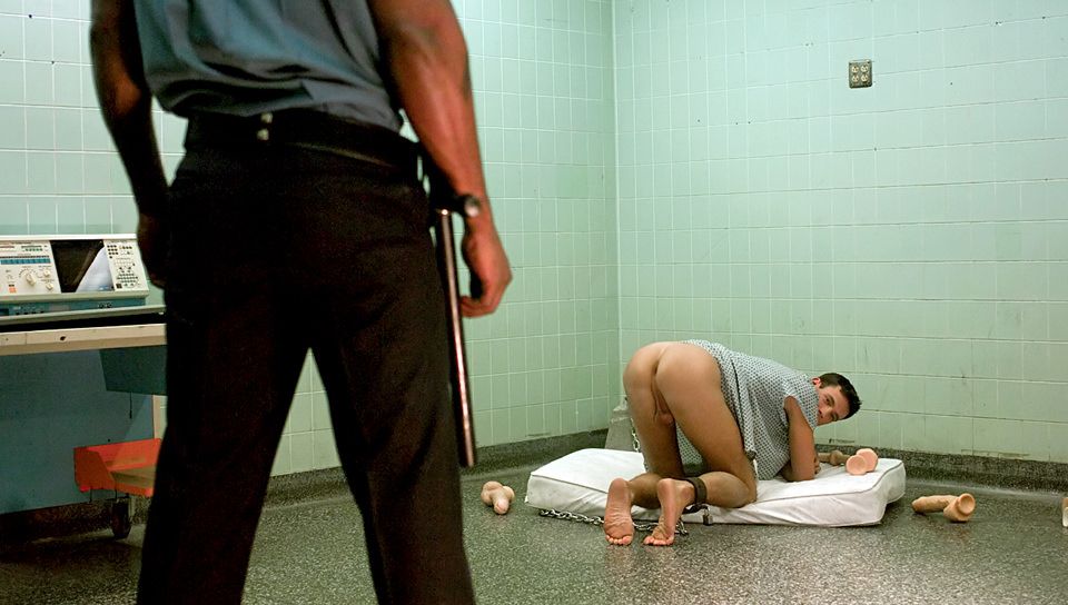 Erik continues his quest for more evidence of shocking behavior. He spies Diesel Washington toting a large bag of dildos and follows the security guard as he enters an isolated cell housing one of the more depraved residents of the asylum. Ryan Raz is chained to the wall, naked and wide-eyed. Diesel knows what will trigger the inmate’s crazy libido. He empties the bag and douses Ryan in a dildo shower. The madman is out of control stuffing as many toys possible into his holes. The guard further taunts him by pulling out his big black cock. Ryan excitedly devours the chocolate stick, stretching his lips and mouth wide open to accommodate its enormous girth. Both men surrender to their manlust. Diesel locks Ryan in an embrace and fucks him hard. Ryan is soon down on his back, then on all fours, getting plugged and moaning like a loon. Diesel stands back to beat his meat, then rains cum down on Ryan who follows with his own burst of spooge.