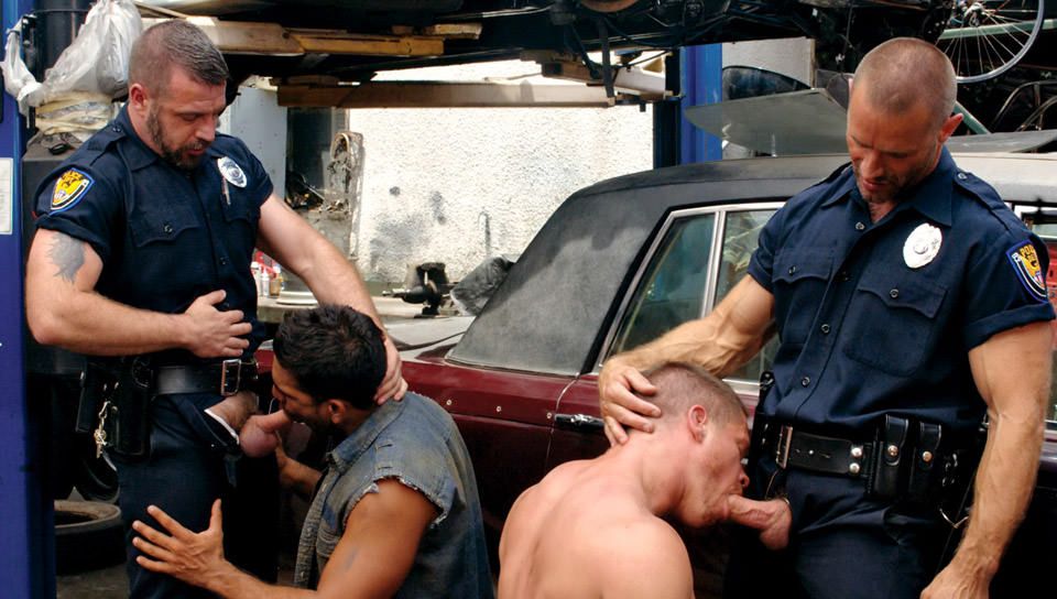 Outside, hot cops Brendon Davies and Danny Mann show up to investigate a disturbance. Ken Browning's is dying to nail some hot cop ass so he gets Nick Marino to flash his ass, and it gets them worked up. The four quickly fuck and suck each other in an explosive orgy, each taking turns nailing each other's hot asses!